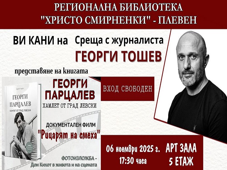 Събитието ще се проведе в Арт залата на петия етаж на библиотеката и ще предложи на публиката богата програма – среща с журналиста Георги Тошев, прожекция на документалния филм „Рицарят на смеха“ и откриване на фотоизложбата „Дон Кихот в живота и на сцената“.